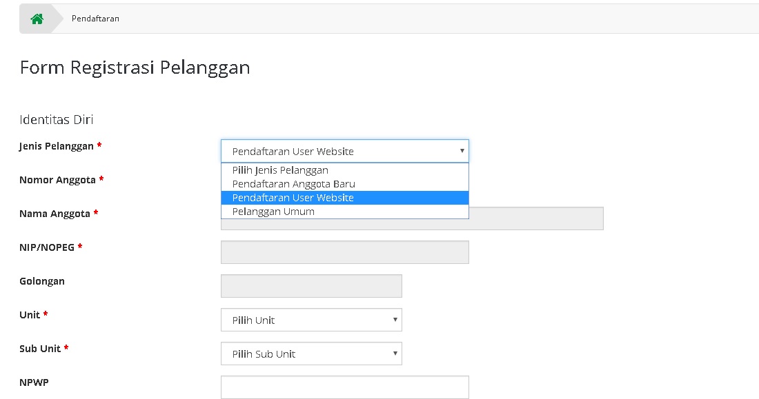 Bila data anda sudah tampil di semua kolom identitas anggota, anggota di wajibkan mengisi kolom username, password,npwp dan data identitas diri yang lainnya.